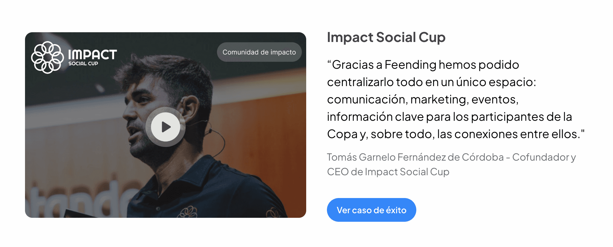 Un ejemplo claro es Impact Social Cup, una comunidad que reúne a emprendedores, inversores y agentes del ecosistema de impacto social. Gracias a Feending, pudieron centralizar la comunicación, los eventos y las conexiones entre participantes en un único espacio digital.