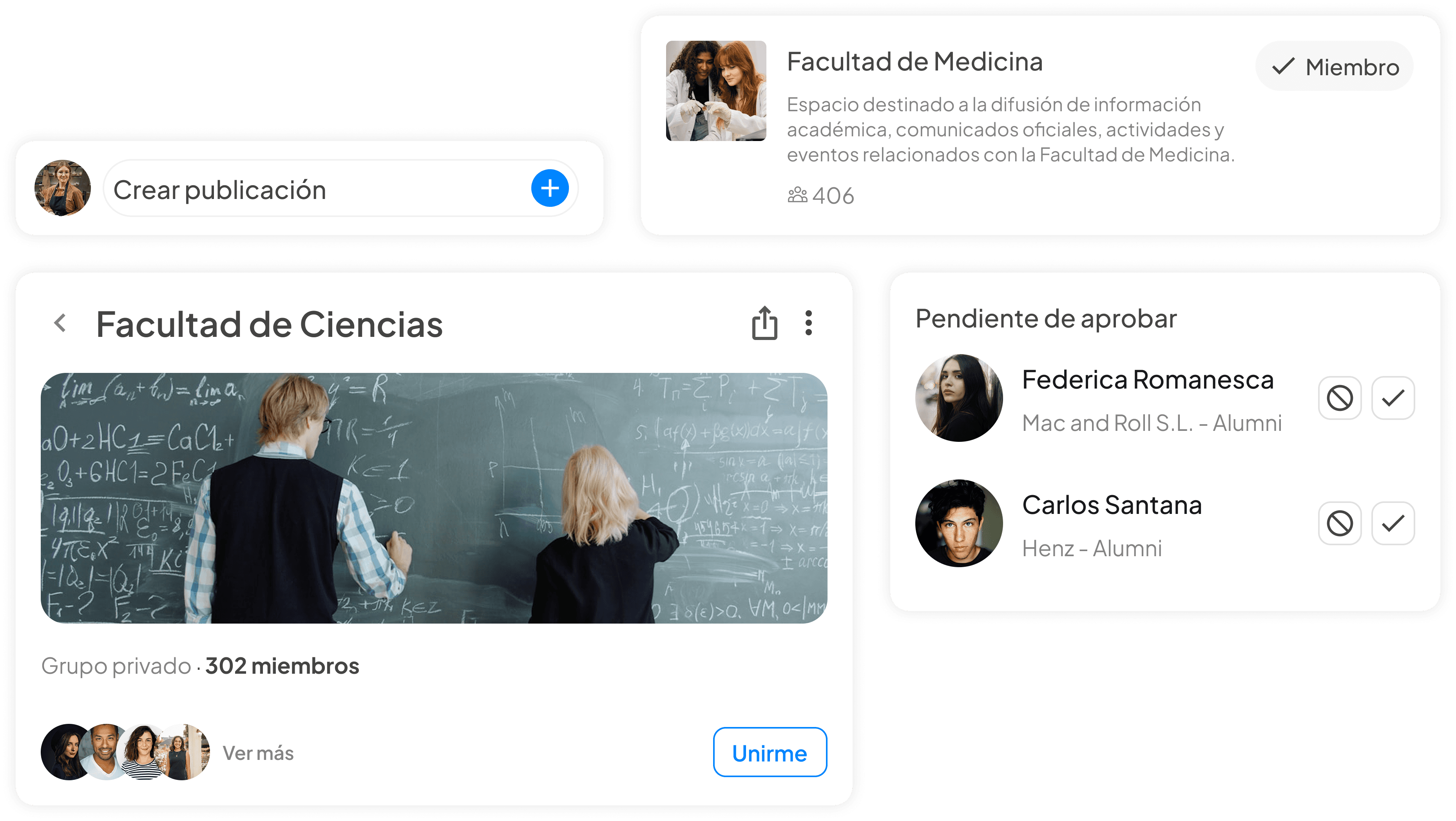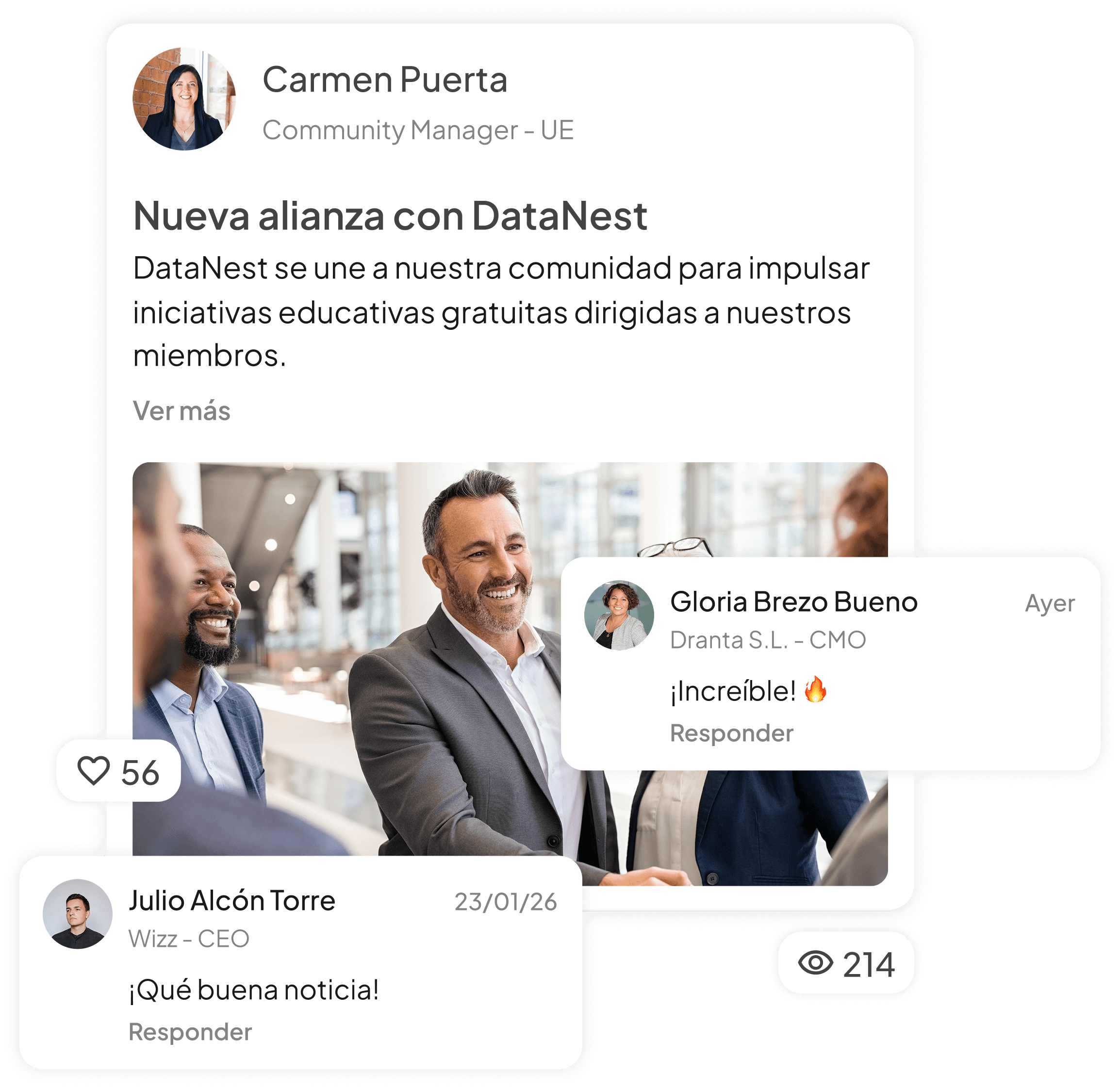 Los miembros pueden publicar, comentar y reaccionar, generando actividad constante y sentido de pertenencia.