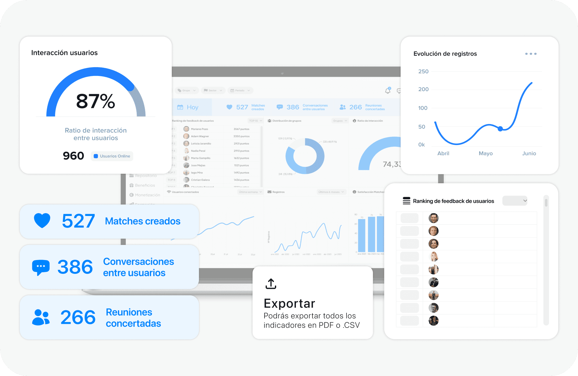 Feending potencia el networking inteligente, automatiza la gestión, mejora el compromiso de los miembros, y facilita el acceso a estadísticas y datos clave para optimizar la toma de decisiones. Todo esto, con una experiencia personalizada para cada usuario.